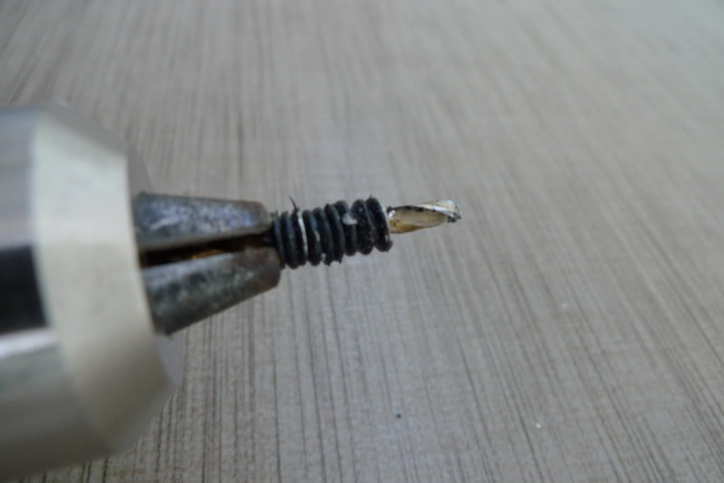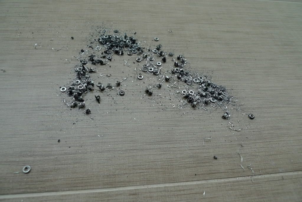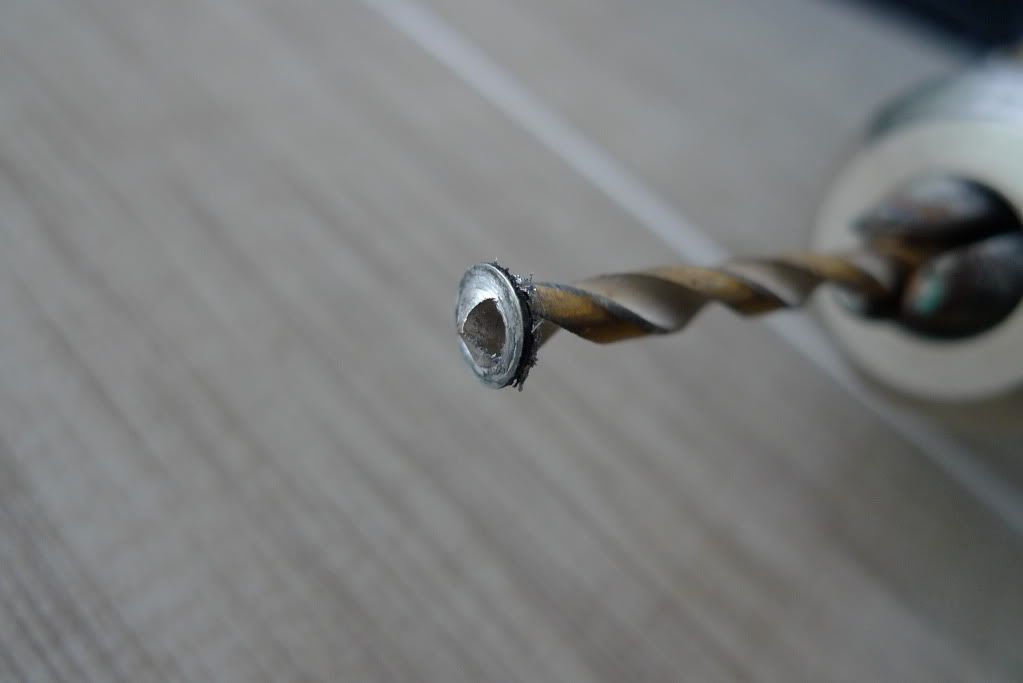 | This is a left over piece of part of the rivet on the drill bit after drilling through |